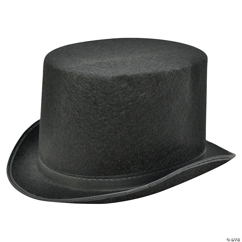 Nice quality felt traditional top hat. Brim measures 1 5/8 inches front, 1 3/8 inches side. Height 5 inches. Measures 24 inches around.