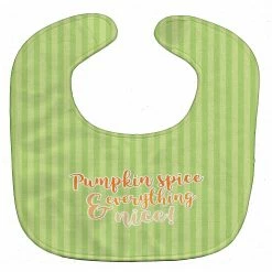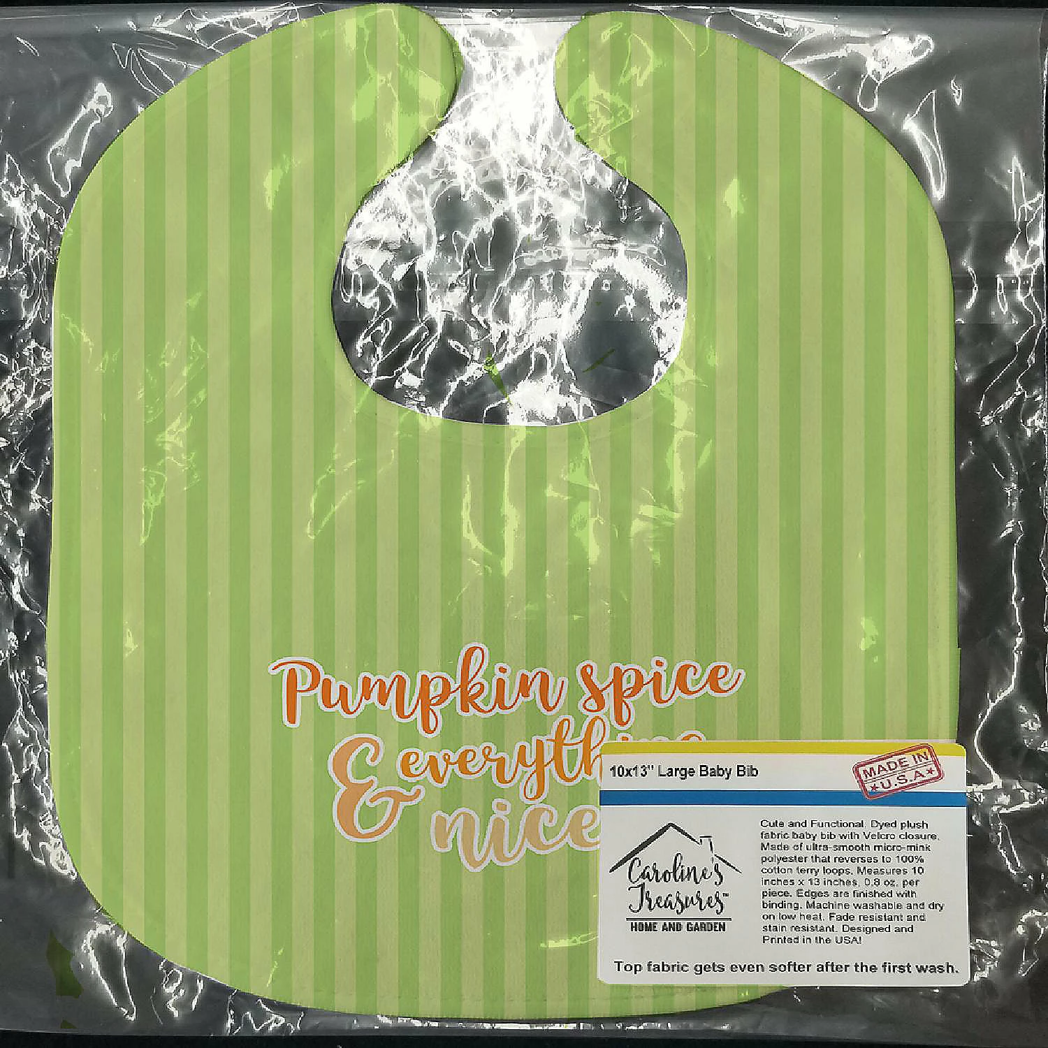 Fall Pumpkin Spice Green Stripe Baby Bib. Cute and Functional. Dyed plush fabric baby bib with Velcro closure. Made of ultra-smooth micro-mink polyester that reverses to 100% cotton terry loops. Measures 10 inches x 13 inches, 0.8 oz. per piece. Edges are finished with binding. Machine washable and dry on low heat. Fade resistant and stain resistant. Top fabric gets even softer after the first wash.