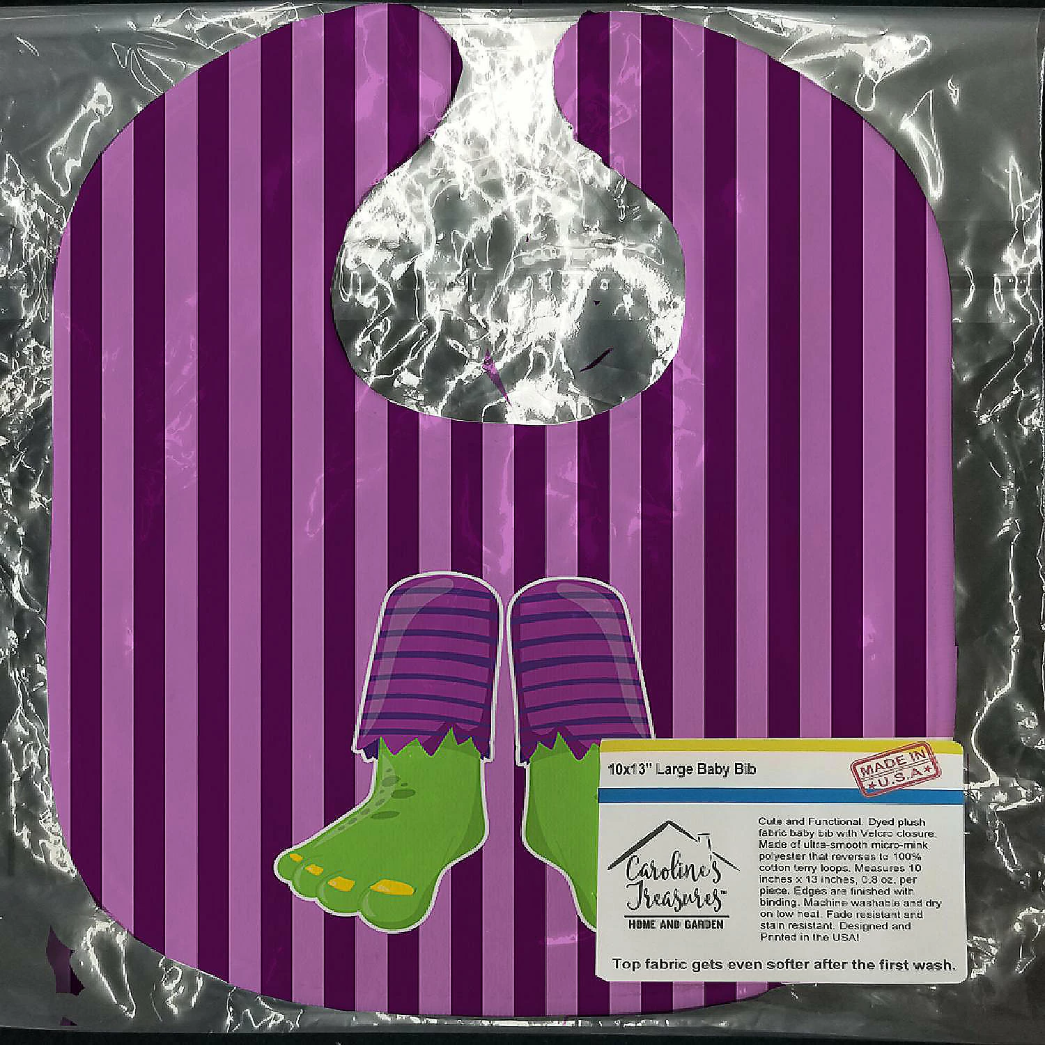 Halloween Frankenstein Feet Baby Bib. Celebrate Halloween with this Halloween Baby Bib. Cute and Functional. Dyed plush fabric baby bib with Velcro closure. Made of ultra-smooth micro-mink polyester that reverses to 100% cotton terry loops. Measures 10 inches x 13 inches, 0.8 oz. per piece. Edges are finished with binding. Machine washable and dry on low heat. Fade resistant and stain resistant. Top fabric gets even softer after the first wash.
