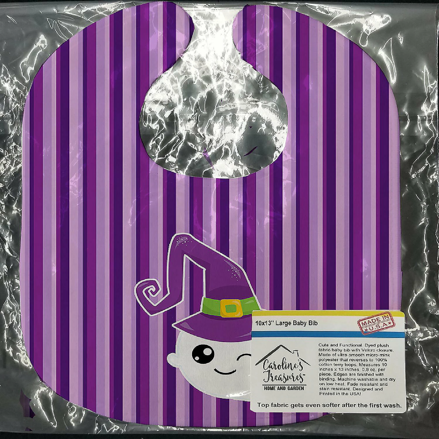 Halloween Ghost Witch Baby Bib. Celebrate Halloween with this Halloween Baby Bib. Cute and Functional. Dyed plush fabric baby bib with Velcro closure. Made of ultra-smooth micro-mink polyester that reverses to 100% cotton terry loops. Measures 10 inches x 13 inches, 0.8 oz. per piece. Edges are finished with binding. Machine washable and dry on low heat. Fade resistant and stain resistant. Top fabric gets even softer after the first wash.