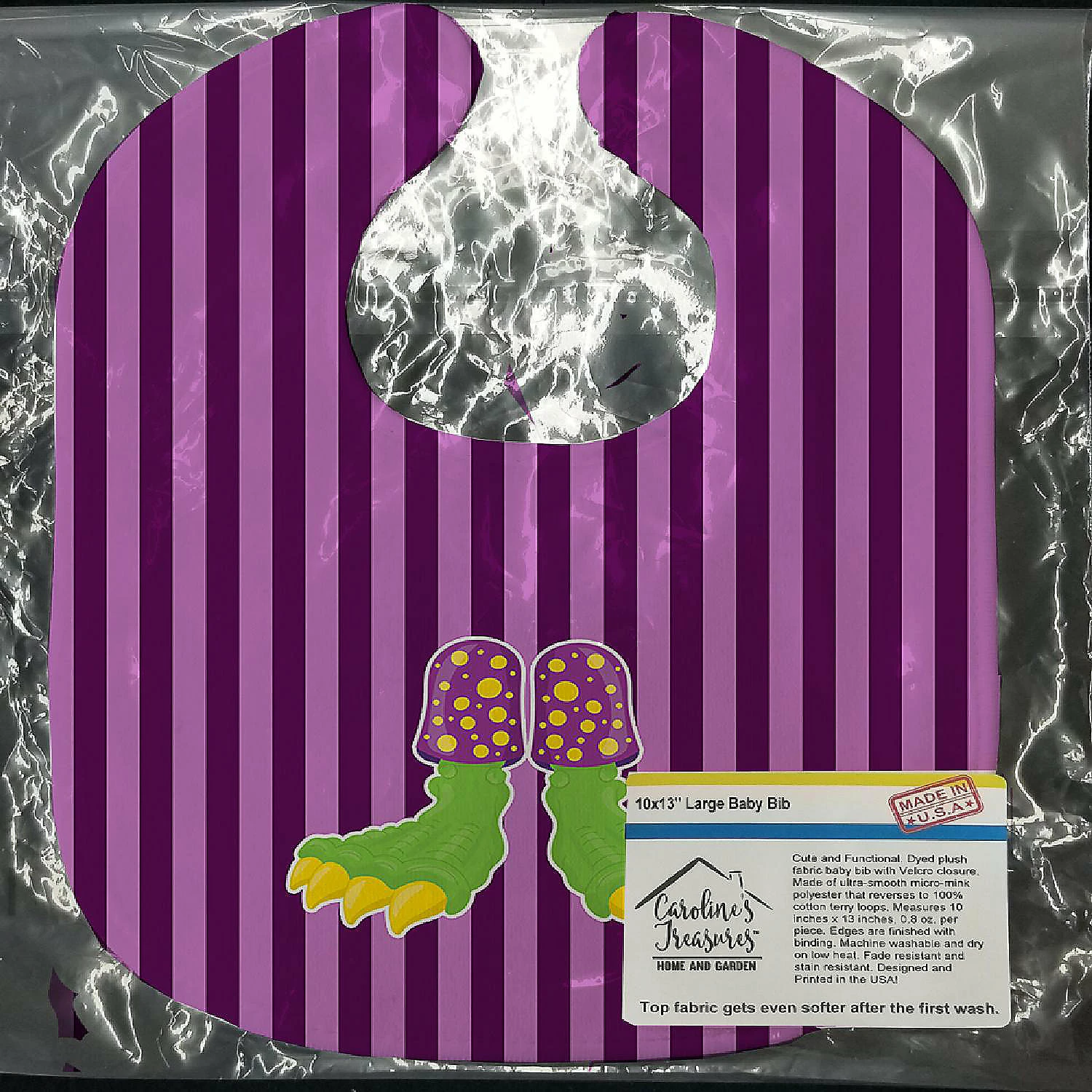 Halloween Monster Feet Baby Bib. Celebrate Halloween with this Halloween Baby Bib. Cute and Functional. Dyed plush fabric baby bib with Velcro closure. Made of ultra-smooth micro-mink polyester that reverses to 100% cotton terry loops. Measures 10 inches x 13 inches, 0.8 oz. per piece. Edges are finished with binding. Machine washable and dry on low heat. Fade resistant and stain resistant. Top fabric gets even softer after the first wash.