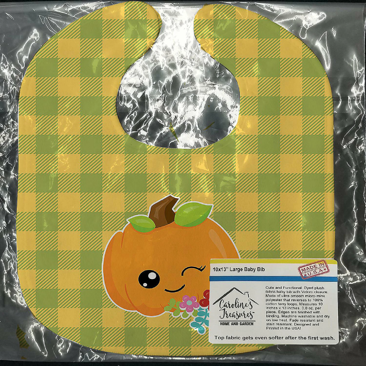 Mr. Winky Pumpkin Baby Bib. Cute and Functional. Dyed plush fabric baby bib with Velcro closure. Made of ultra-smooth micro-mink polyester that reverses to 100% cotton terry loops. Measures 10 inches x 13 inches, 0.8 oz. per piece. Edges are finished with binding. Machine washable and dry on low heat. Fade resistant and stain resistant. Top fabric gets even softer after the first wash.
