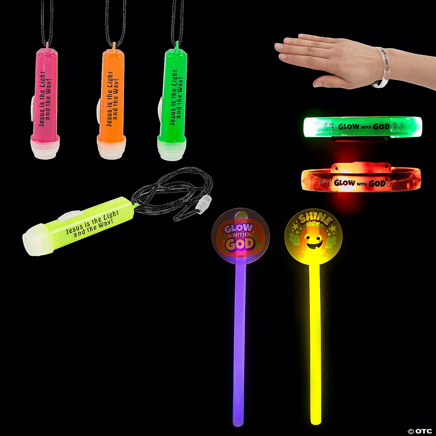 Kids will love using these festive light-up accessories as they cruise through the night trick-or-treating guided by God’s light! This convenient kit is packed with an assortment of fun faith-inspired novelties that are perfect handouts for trunk-or-treating events. They’re also great party favors for a Halloween party at Sunday School or in the classroom. Simply place these bright and colorful giveaways in goody bags with candy and other toys from this website. (72 pcs. per unit) Includes:• 24 Plastic Christian Pumpkin Flashlights on a Rope (Each 3 1/2″ flashlight is on a 36″ nylon cord. Requires 1 “AA” battery, not included.)• 24 Plastic Christian Pumpkin Glow Wands (8 1/4″ Simply snap and shake to activate the glow.)• 24 Plastic Christian Pumpkin Glow with God Light-Up Bracelets (7 1/2″ Includes batteries.)• Assortments are subject to change at any time and may vary from picture shown. Substituted items will be similar in nature.