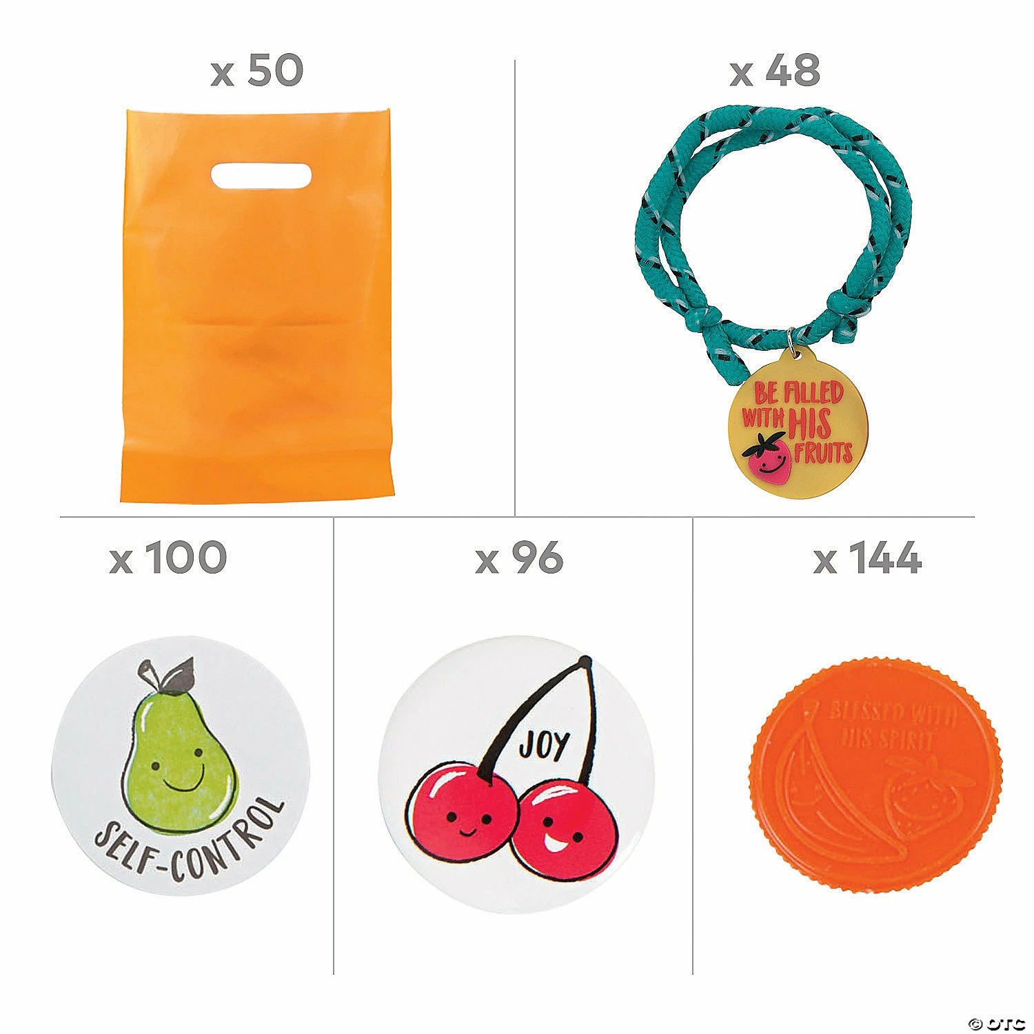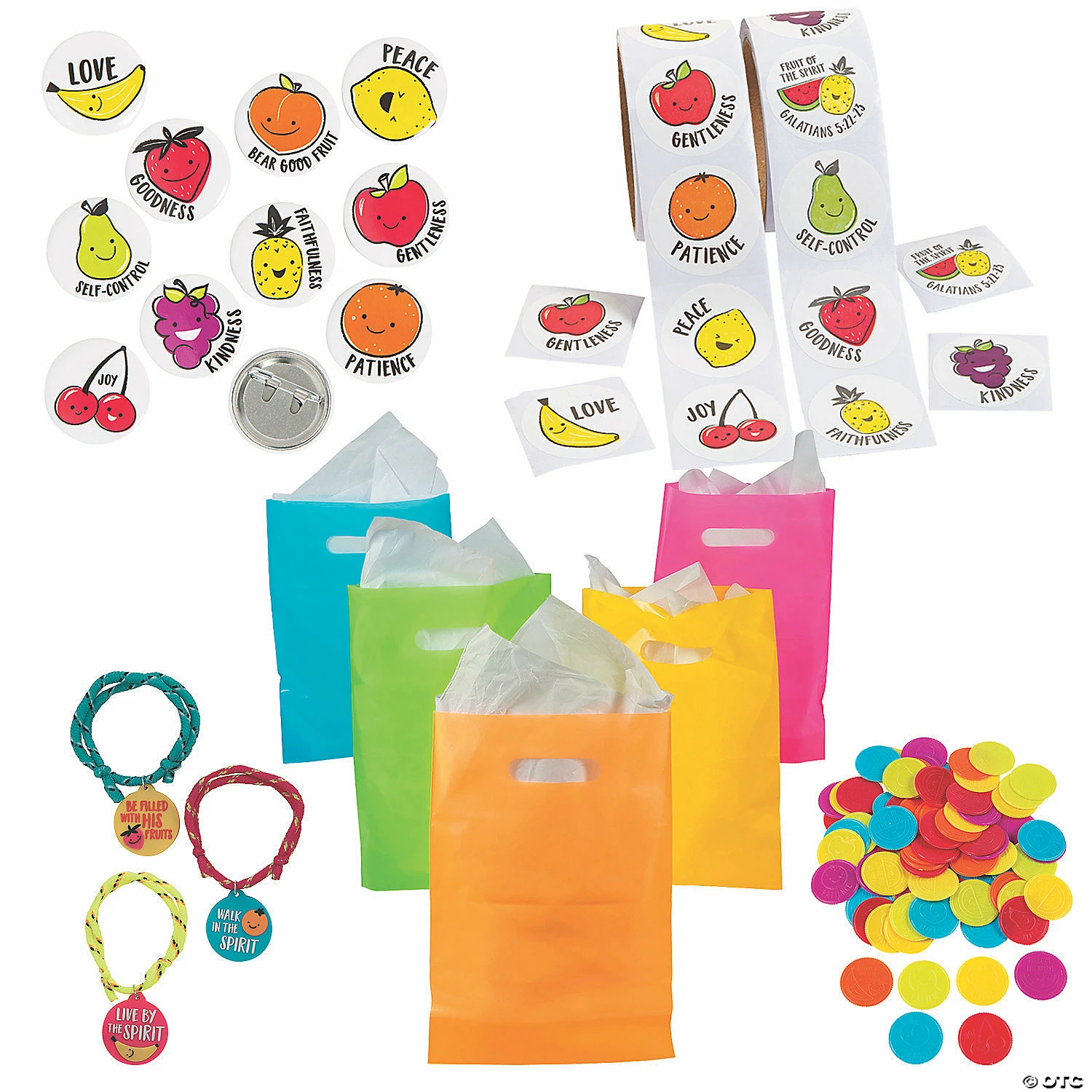 Make a Sunday School lesson on the Fruit of the Spirit come to life with this helpful kit, packed with enough bags, stickers, wearables and more for up to four dozen kids. This handout kit features a variety of small, faith-filled giveaways that can be tucked into the included goody bags for easy distribution to kids. (438 pcs. per unit) Simple assembly required. Assortment may vary. Includes:• 48 Nylon Fruit of the Spirit Rope Bracelets (Adjusts up to 13″ circ.)• 96 Metal Mini Fruit of the Spirit Buttons (1″)• 144 Plastic Fruit of the Spirit Coins (1 1/2″)• 100 Fruit of the Spirit Scented Stickers (1 1/2″)• 50 Plastic Neon Goody Bags (8 1/2″ x 12″)