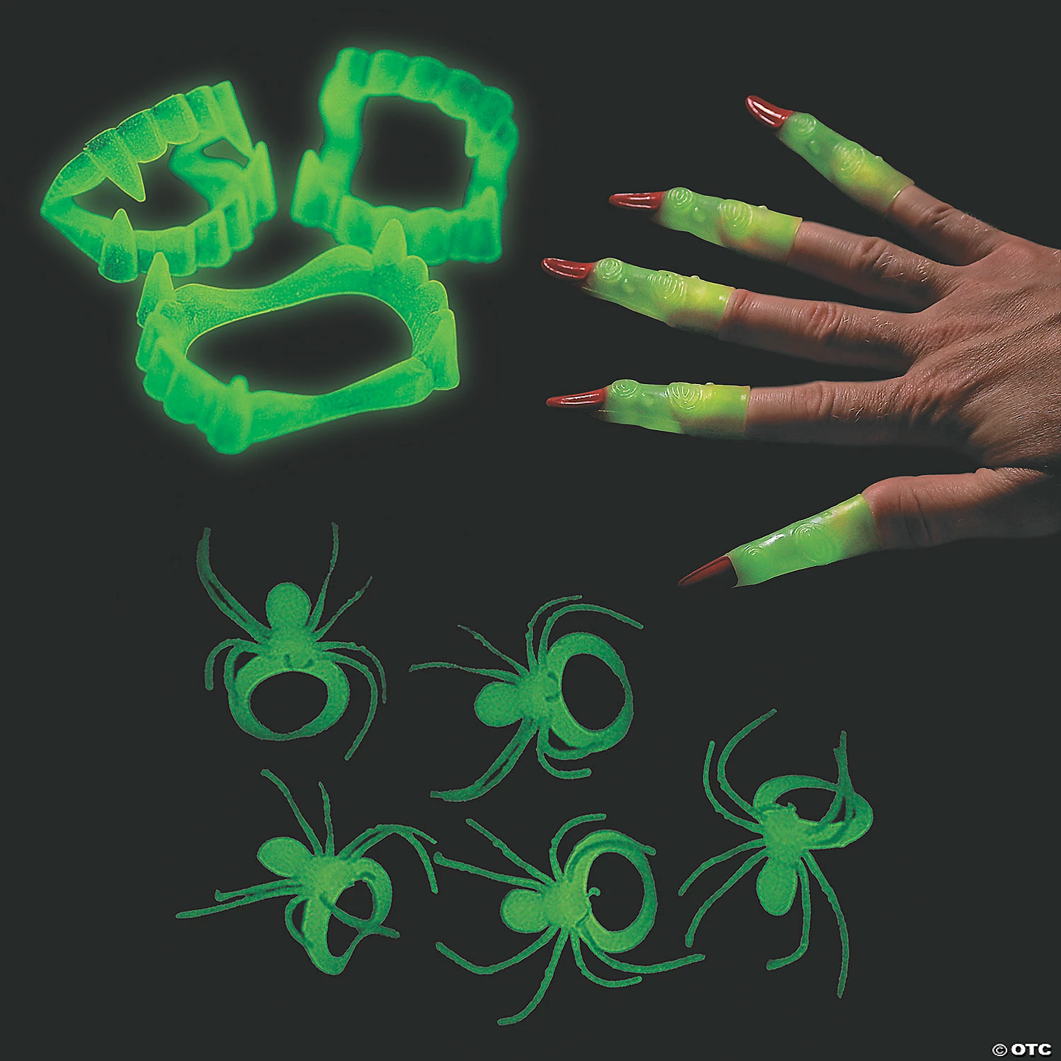 Do you need to transform a bunch of normal kids into creepy Halloween creatures quickly? This kit can help! Featuring a variety of glow-in-the-dark Halloween accessories from vampire fangs to Martian fingers, this kit is the perfect addition to a kids’ Halloween party or to stock up on Halloween handouts for kids. (288 pcs. per unit) Assortment may vary. Expose items to direct sunlight to activate glow.Includes:• 72 Vinyl Glow-in-the-Dark Martian Fingers (3″)• 144 Glow-in-the-Dark Spider Rings (2″)• 72 Plastic Glow-in-the-Dark Vampire Fangs (2 1/2″)