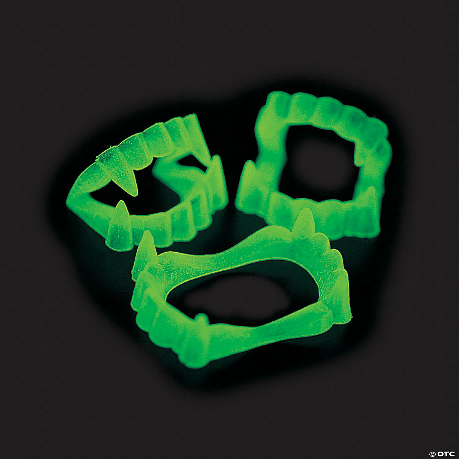 Take a bite out of Halloween night with these Glow-In-The-Dark Vampire Teeth. Plastic vampire fangs are the perfect accessory to spruce up any Halloween costume. Turn off the lights and watch them glow in the dark as you wear these terrifying vampire teeth with your favorite vampire or monster outfit. You can also hand them out to trick-or-treaters for a truly glowing goody. Add these fangs to your Twilight Eclipse party as a fun favor! (6 dozen per unit) 2 1/2″ Expose items to daylight to activate glow.