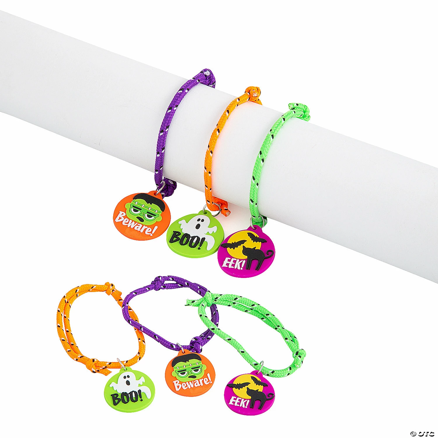These cute friendship bracelets are filled with Halloween charm! Featuring three different designs with three different Halloween characters on the silicone charms, these rope bracelets are perfect for Halloween celebrations. Give them out as party favors or use them as trick-or-treat items. Nylon with silicone charms. (2 dozen per unit) Adjustable up to 13″ circ. with a 1 1/4″ charm. © OTC