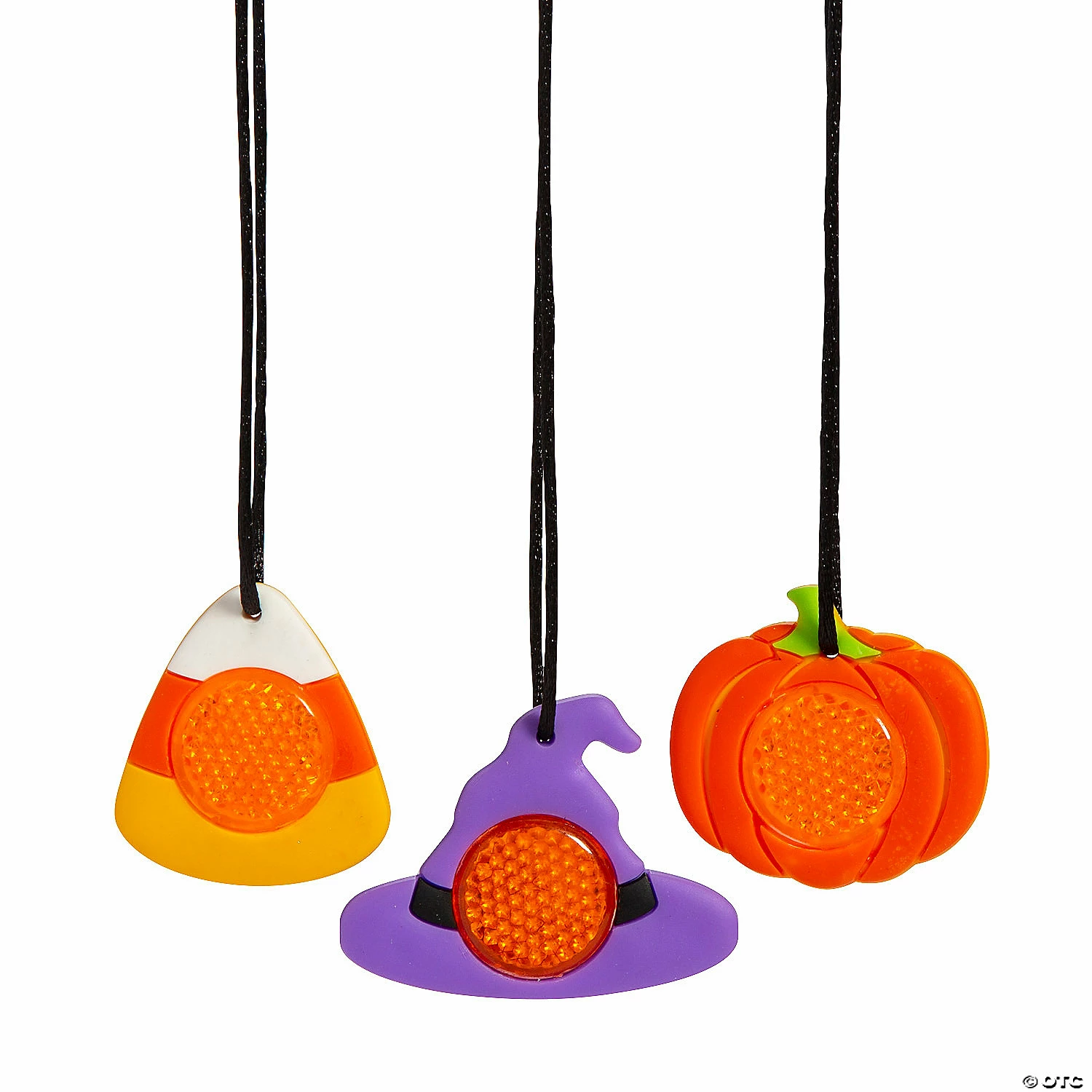 Grab these adorable candy corn, witch hat and pumpkin necklaces to hand out as favors at a trunk-or-treat event. Kids will be delighted to wear these adorable reflective necklaces as costume accessories while trick-or-treating! Rubber. Each 2″ character charm is on a 24″ cord. For novelty use only. © OTC