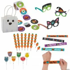 Use this handout kit to have a spook-tacular time giving out hauntingly awesome party favors! Guests will get a thrill when you surprise them with this purr-fect selection of Halloween favors at your Halloween party. Watch for boo-tiful smiles when partygoers receive these gifts. (61 pcs. per unit)Includes:• 12 Goofy Monster Lollipops (Each 2″ sucker is on a 4″ stick. Orange, lemon, strawberry, apple, grape and cherry flavors. Individually wrapped. Total wt. 7 oz. Fat-free. Assorted. Candy is non-returnable. For more information, visit our “Return Policy” page located on our website. Ingredient, nutrition, allergen and other product information are provided on our Web and Mobile sites for reference purpose only, without warranty or representation as to accuracy. Manufacturers adjust their labeling regularly and are solely responsible for the accuracy of the information. For general questions concerning these items, please contact our customer service at 800-228-0475.)• 12 Metal Goofy Ghouls Slap Bracelets (8 1/4” Assorted.)• 12 Paper Small Ghost Gift Bags (4 1/2″ x 4 1/2″ x 4 3/4″)• 12 Cardstock Make a Halloween Mask Sticker Scenes (14 1/2″ x 6″ Includes 12 sticker sheets and 12 masks.)• 1 Paper Halloween Pun Sticker Roll (1 1/2” diam. 100 pcs. per roll, shrink-wrapped. Assorted.)• 12 Plastic Stacking Halloween Pencils (5”)• Assortments are subject to change at any time and may vary from picture shown. Substituted items will be similar in nature.