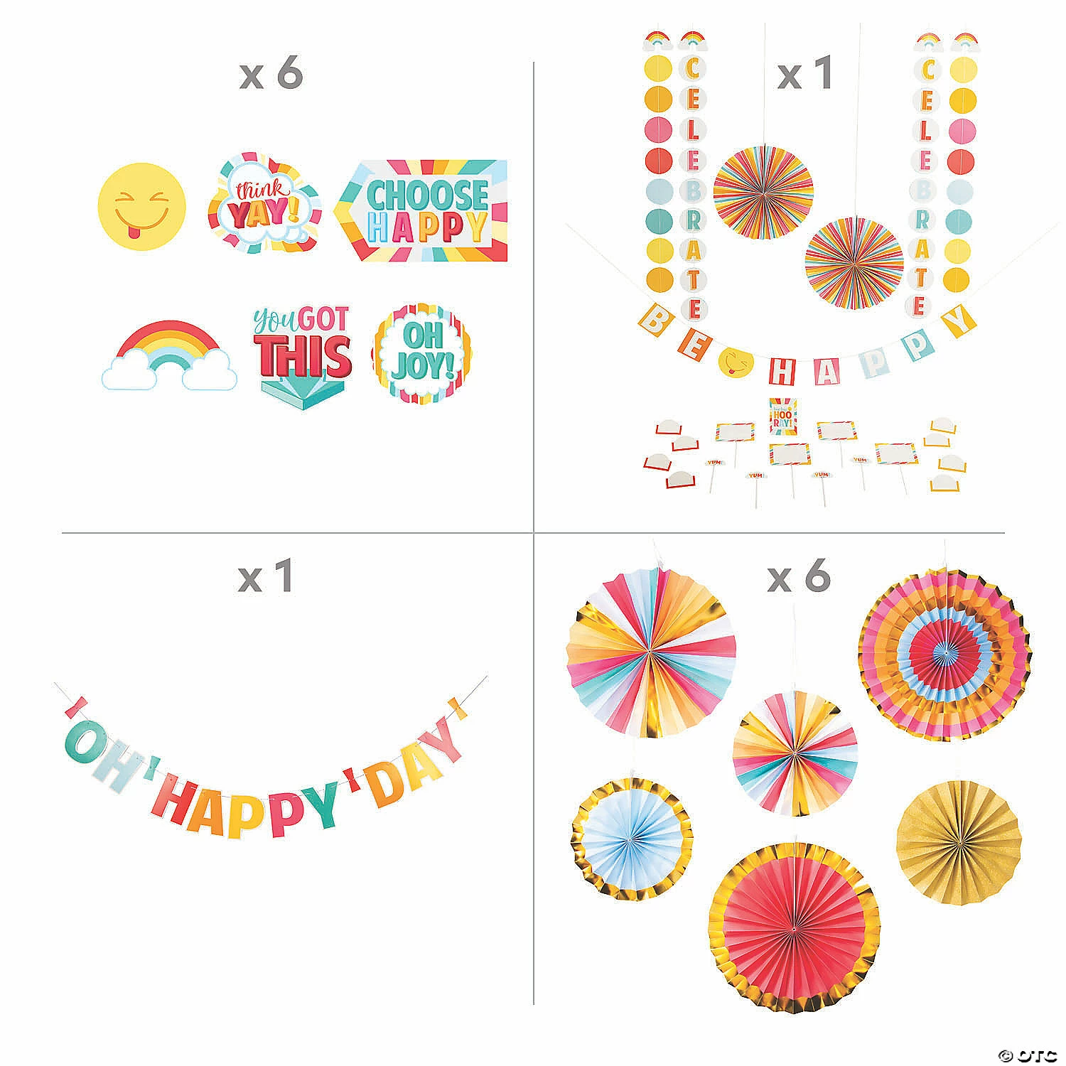 Bring joy and positivity to any day with the help of this good vibes decorating kit! Perfect for birthday parties or celebrations of achievement, this decorating kit can be used for any time that needs some good vibes and a reminder that you can make it a happy day. This kit features a variety of decorations that can transform any space into a happy place! (38 pcs. per unit) Simple assembly required. Assortment may vary. © OTCIncludes: • 6 Cardstock Happy Day Cutouts (17″ – 29″ x 13″ – 18″)• 24-Pc. Happy Day Decorating Kit (24-pc. kit. Includes one 6″ tent card, eight 2 1/2″ tent cards, two 16″ diam. fans, one 64″ banner, four 4 ft. string decorations, four 8 1/4″ picks and four 12″ picks.)• 2-Pc. Cardstock Happy Day Garland (7 ft. – 9 ft.)• 6 Paper Happy Day Party Fans (10″ – 14″)