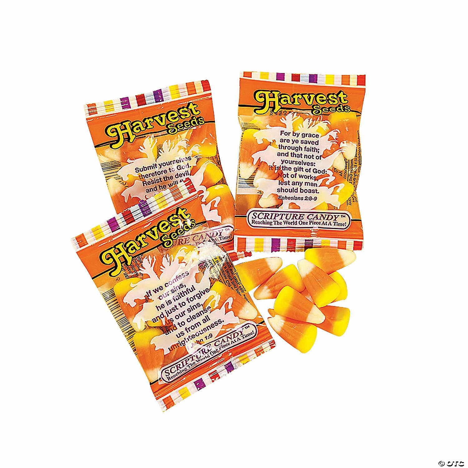 Sow some spiritual seeds with this scripture candy corn! Give these candy corn treats to trick-or-treaters on Halloween for a sweet holiday twist! Each package includes approx. 9 pcs. in a Bible verse wrapper. (17 pkgs. per unit) Total wt., 8.5 oz.• Fat-free.• Nut-free.• Candy is non-returnable. For more information, visit our “Return Policy” page located on our website.• Made in the USA, Important Country of Origin Information: For certain items sold by OTC on our Web or Mobile sites, country of origin information can change and what is displayed may not be accurate or consistent with manufacturer information. For up to date country of origin information, it is recommended that you rely on product packaging or other manufacturer information• Nut-free. • Ingredient, nutrition, allergen and other product information are provided on our Web and Mobile sites for reference purpose only, without warranty or representation as to accuracy. Manufacturers adjust their labeling regularly and are solely responsible for the accuracy of the information. For general questions concerning these items, please contact our customer service at 800-228-0475.